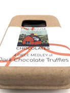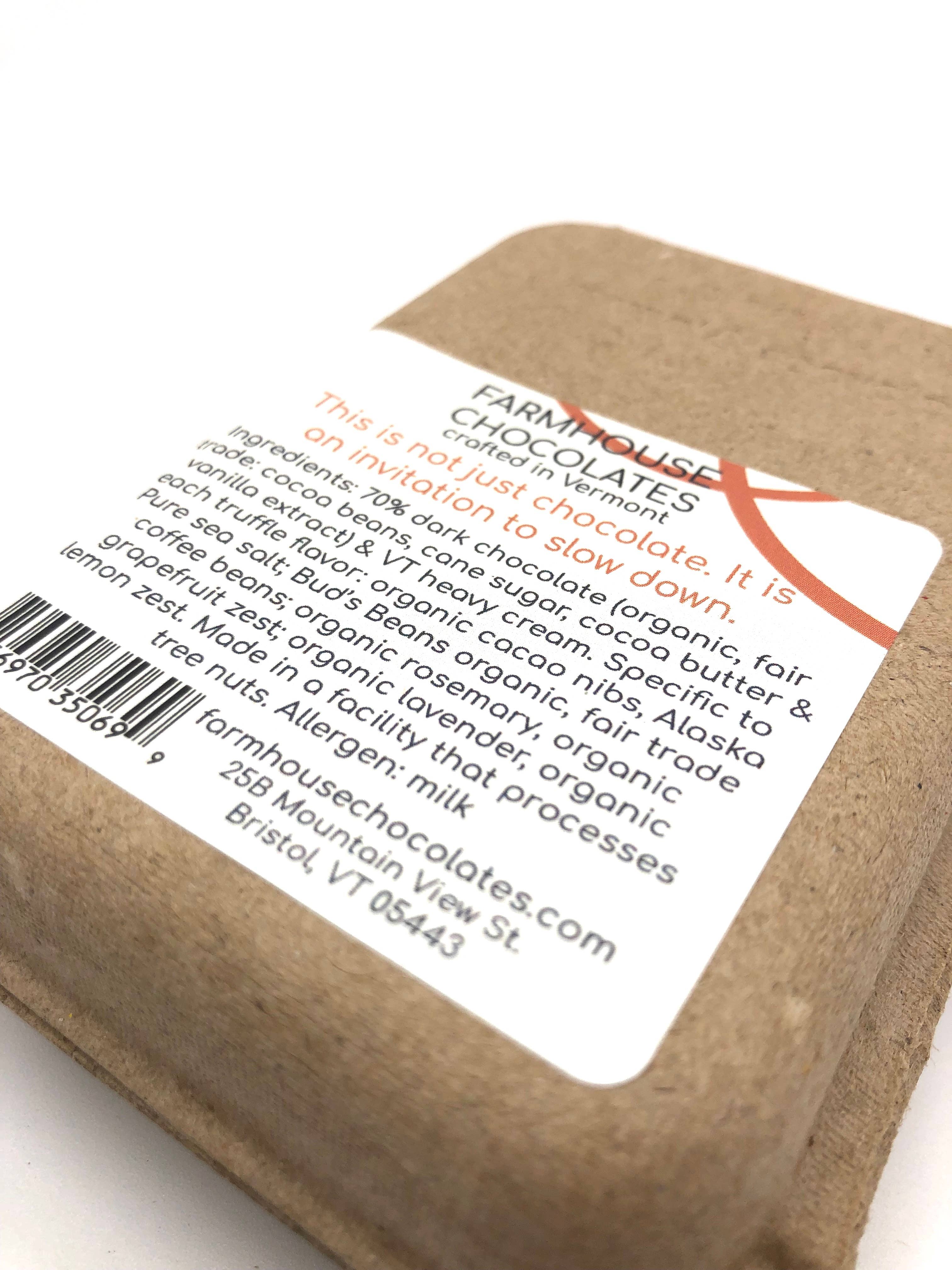 Dense, dark, delightfully balanced. These European-style, chocolate-centric truffles come nestled in a charmingly unique, eco-friendly box. The ganache center of each truffle is crafted with our 70% organic, fair trade, soy-free chocolate, a splash of Vermont heavy cream, and infused with ingredients like organic grapefruit zest and fresh, organic rosemary. No shortcuts, and you can taste it. The truffles are then dipped in the same organic dark chocolate and decorated for flavor distinction. Our 4 piece truffle medley box contains 1 of each of the following flavors: Cacao Nib & Sea Salt Truffle Espresso Bean Truffle Rosemary-Grapefruit Truffle Lavender-Lemon Truffle