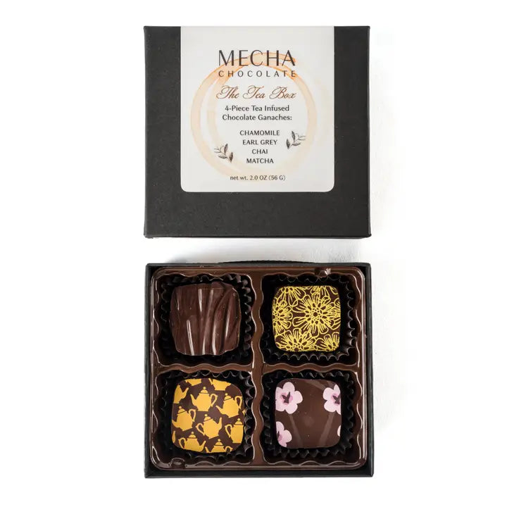 A perfect gift for the tea lover, this box includes four tea-infused ganaches: Chai Tea, Chamomile, Japanese Matcha and Earl Grey. The box includes a small card, with all flavors listed. Shelf Life: 2-3 months.
