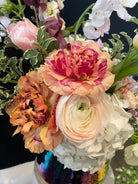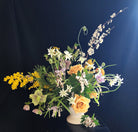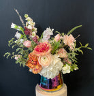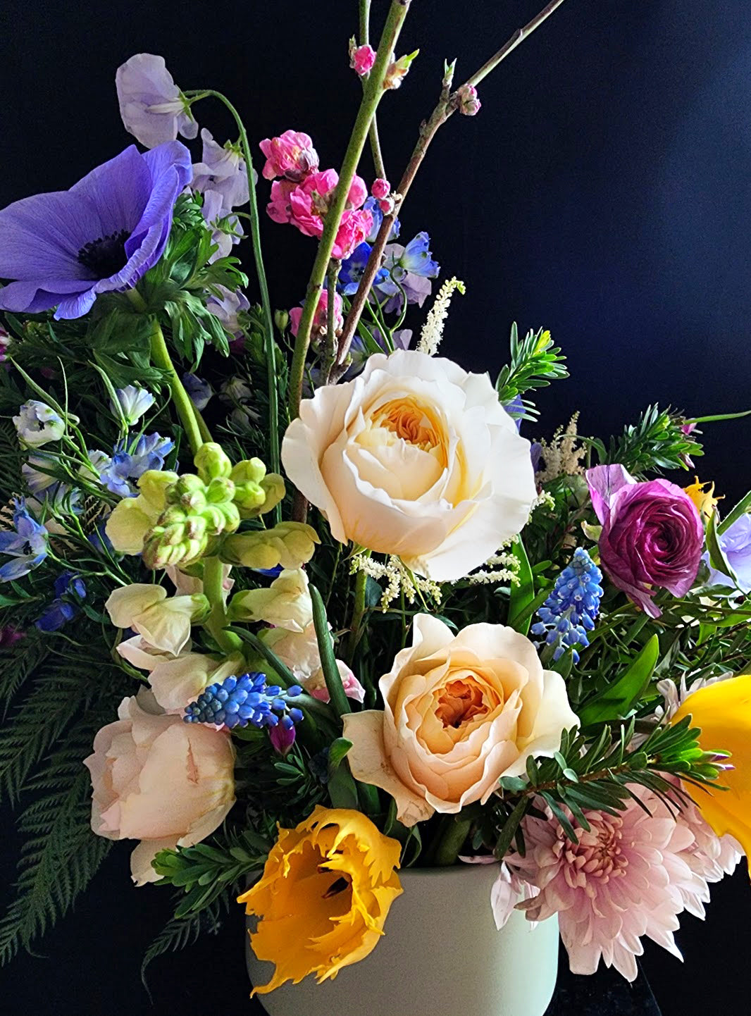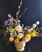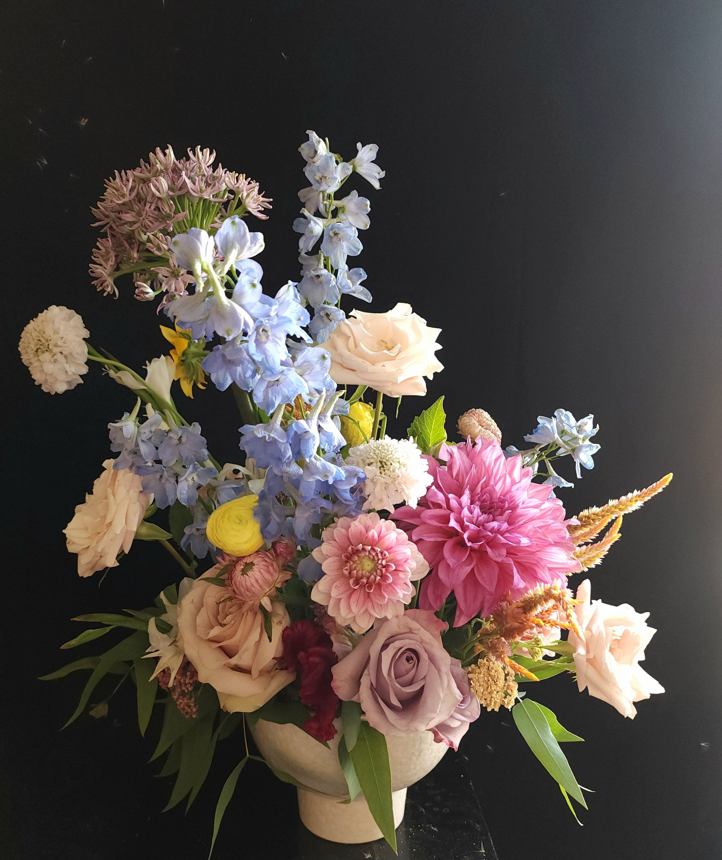 Our arrangements are designers choice and vary based on which flowers are in season! If you have color preference we will do our best to accommodate. Please note any desired specifications when placing your order or give us a call to discuss what options are available!