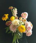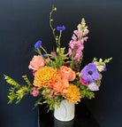 Our arrangements are designers choice and vary based on which flowers are in season! If you have color preference we will do our best to accommodate. Please note any desired specifications when placing your order or give us a call to discuss what options are available!