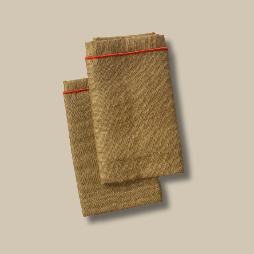 Green linen napkins with embroidered edge. Sure to please, these cloth dinner napkins are made with a softened green linen with a contrasting thread embroidered edge.