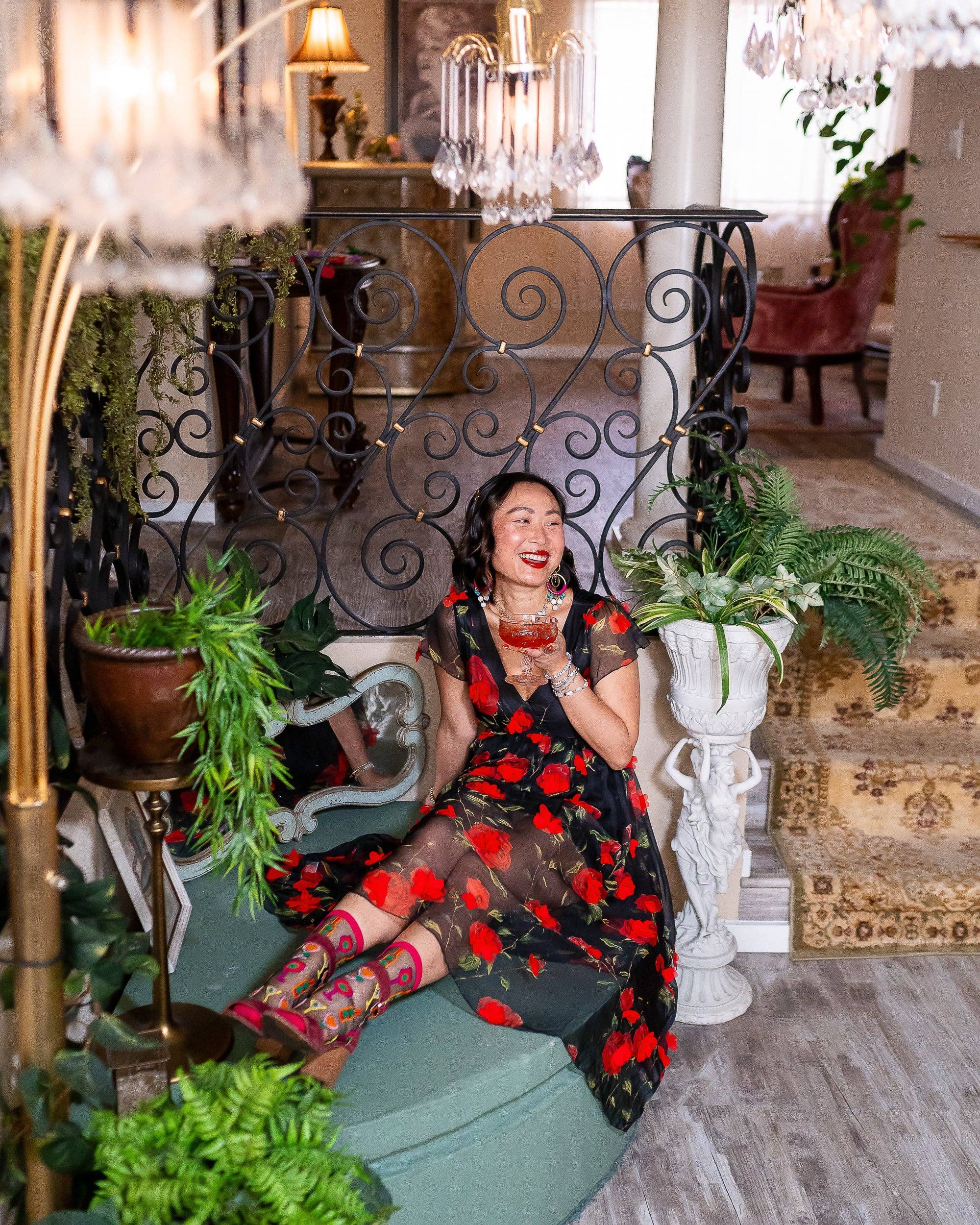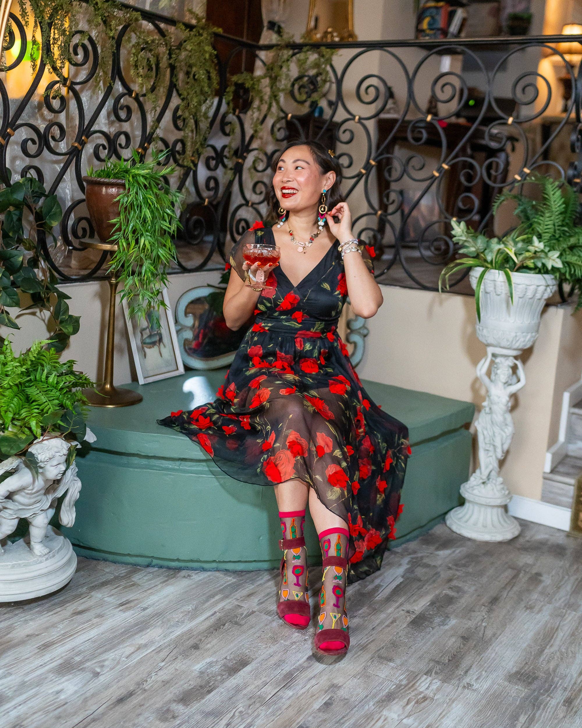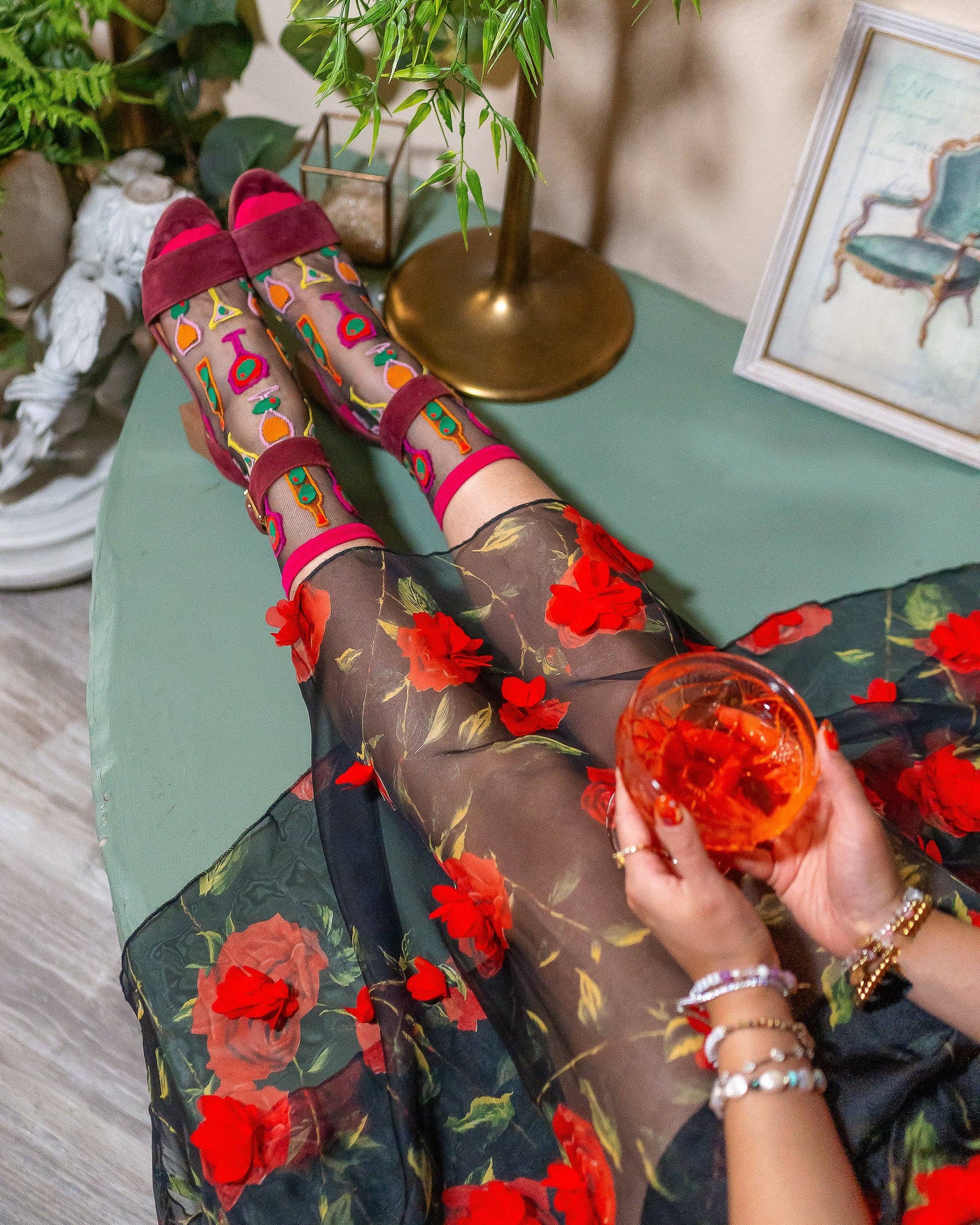 Our Cocktail Hour black sheer sock features wine glasses, martinis, and wine bottles with an unexpected olive twist. The graphic print and electrifying colors give this sock an art museum vibe, perfect for paint and sip nights with the girls. Finished with a mulberry colored cuff, heel, and toe for a sultry look. One Size. Recommended fit US W5.5-10. 200 Needle Count. ✨ Funky yet elegant - no silly or childish patterns 🧦 Premium quality - durably made with comfortable stretch 👗 Unique - the perfect accessory to add individuality to your outfits