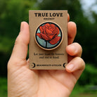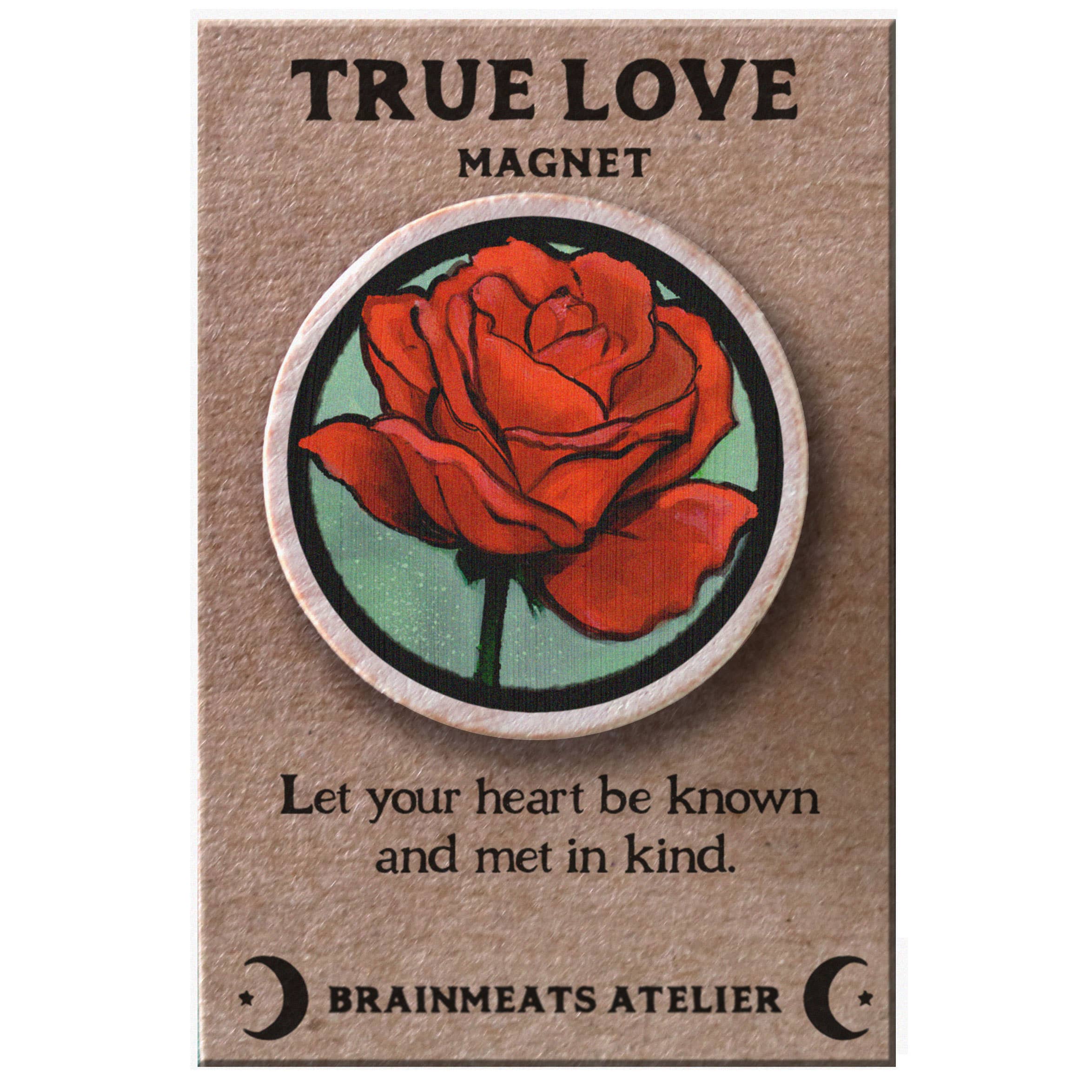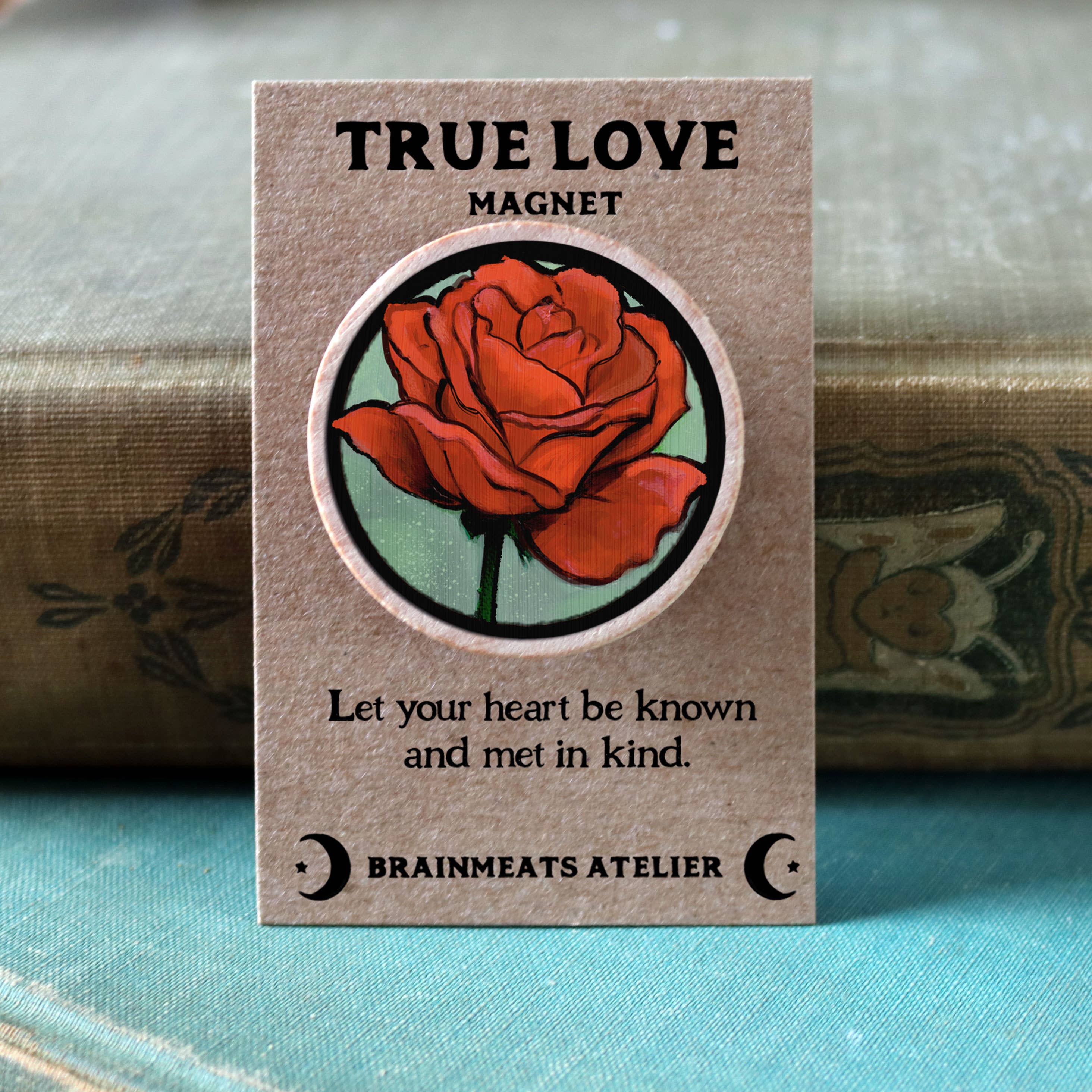 The True Love Magnet is a rose-inspired token representing devotion, joy, and connection. Crafted from decoupaged wood with a vibrant rose illustration, each magnet is backed with a 5/8" ceramic magnet and mounted on a card featuring the mantra: "Let your heart be known and met in kind." An ideal gift for shops catering to romance, self-love, and chosen family themes. • Size: 2" wooden disc with full-color illustration • Backed with 5/8" ceramic magnet • Mounted on a 2" × 3" printed backer card